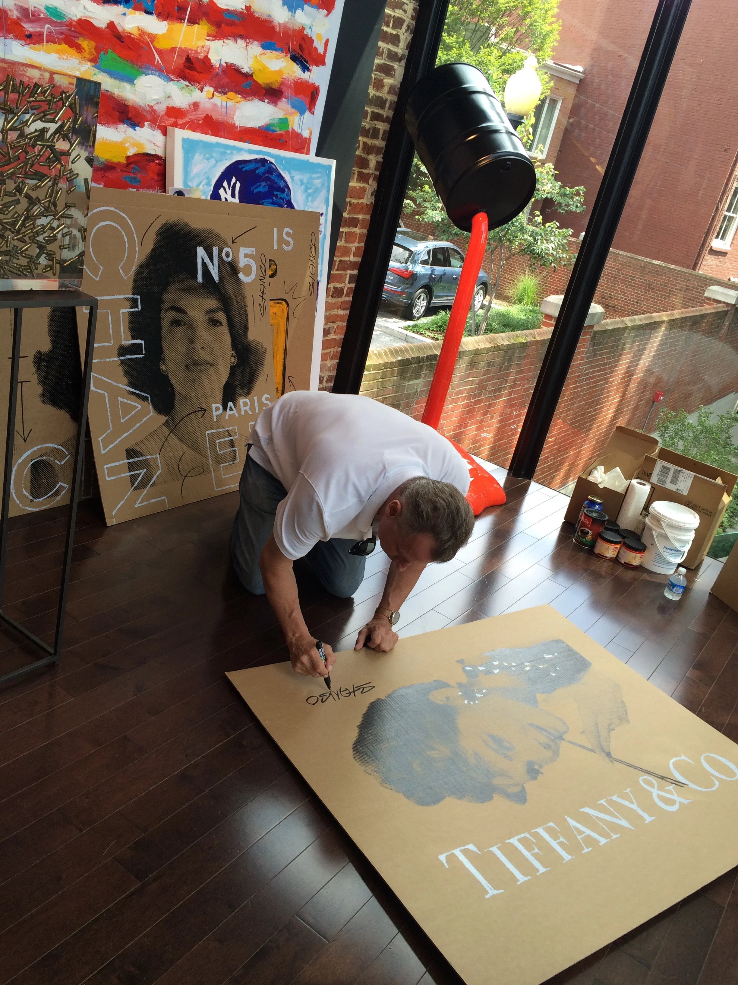 Currently working out of a large backwoods warehouse in Philadelphia, John draws artistic inspiration from retro advertising, pop icons, B-movies, mid-century modernism, magazines, noir films, vintage signage and all things pop-culture. Forming a unique combination of silk-screening and hand painting, John creates paintings that are at once nostalgic and modern. Intense brush strokes, explosions of color, aggressive textures, and juxtaposed images yield distinctive and recognizable canvasses. His subjects—sexy bombshell women, designer logos, sports heroes, Superheroes, stewardesses, Americana images—compete with and complement one another, yielding exceptional artistic compositions. Batman and Elvis, Audrey Hepburn and Lucky Strike, Mickey Mouse and Heineken all find themselves reborn in John’s paintings.